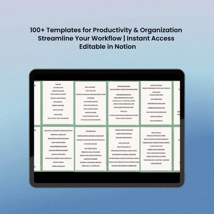 Unlock the full potential of Notion with this all-in-one bundle of 50+ Notion templates, designed to streamline your daily life, elevate your projects, and skyrocket your productivity. Whether you're a student, creator, entrepreneur, or just someone who loves planning—this pack has something tailored for you.